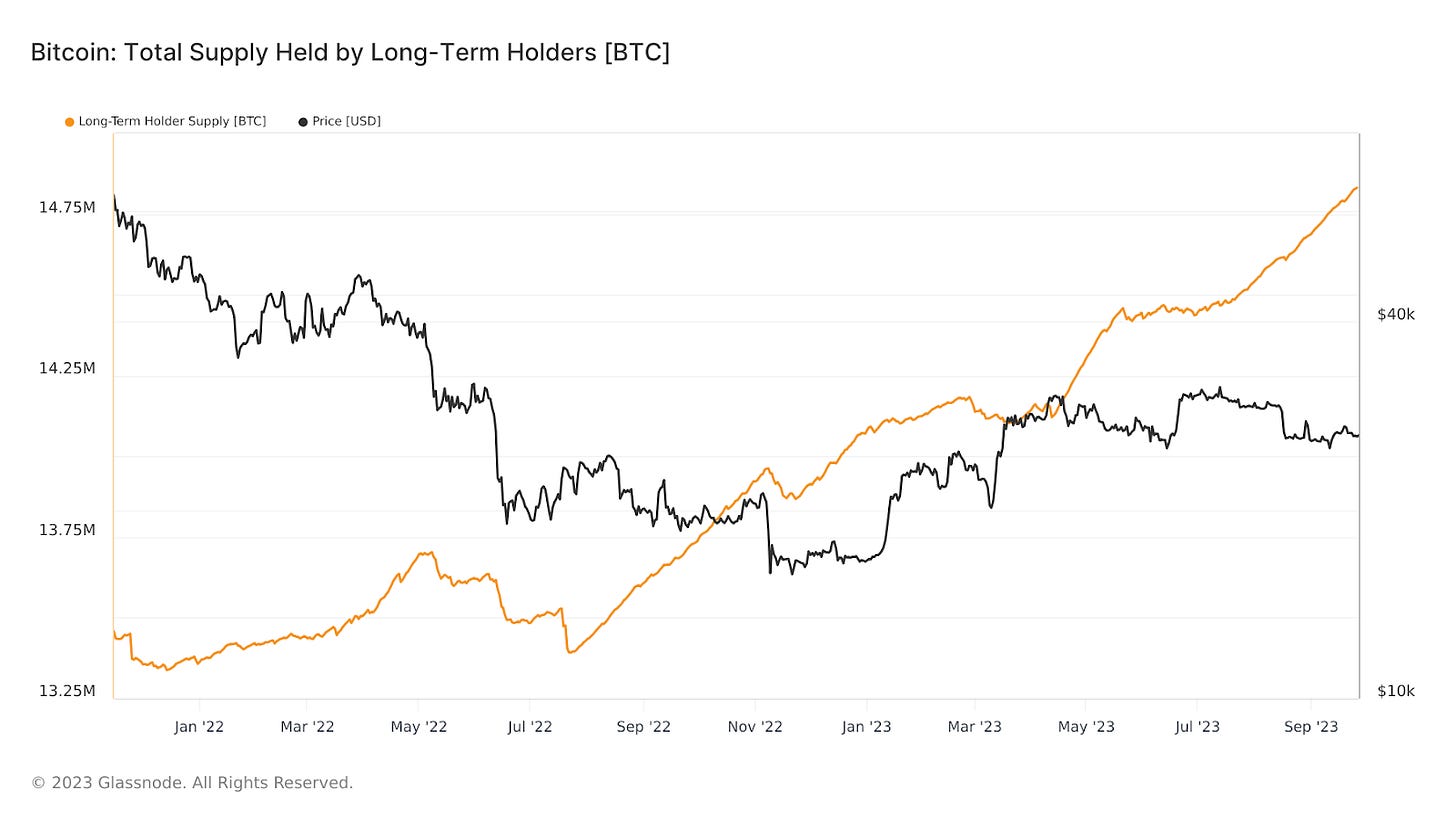 Bitcoin being held long term has been growing steadily over 2023. Since April of this year, BTC holding data has gone up a whopping 5% and 8% YTD. The recent 30 day jump of 0.7% accounts for almost 9% of the BTC being held this year, which could mean long term confidence is increasing.