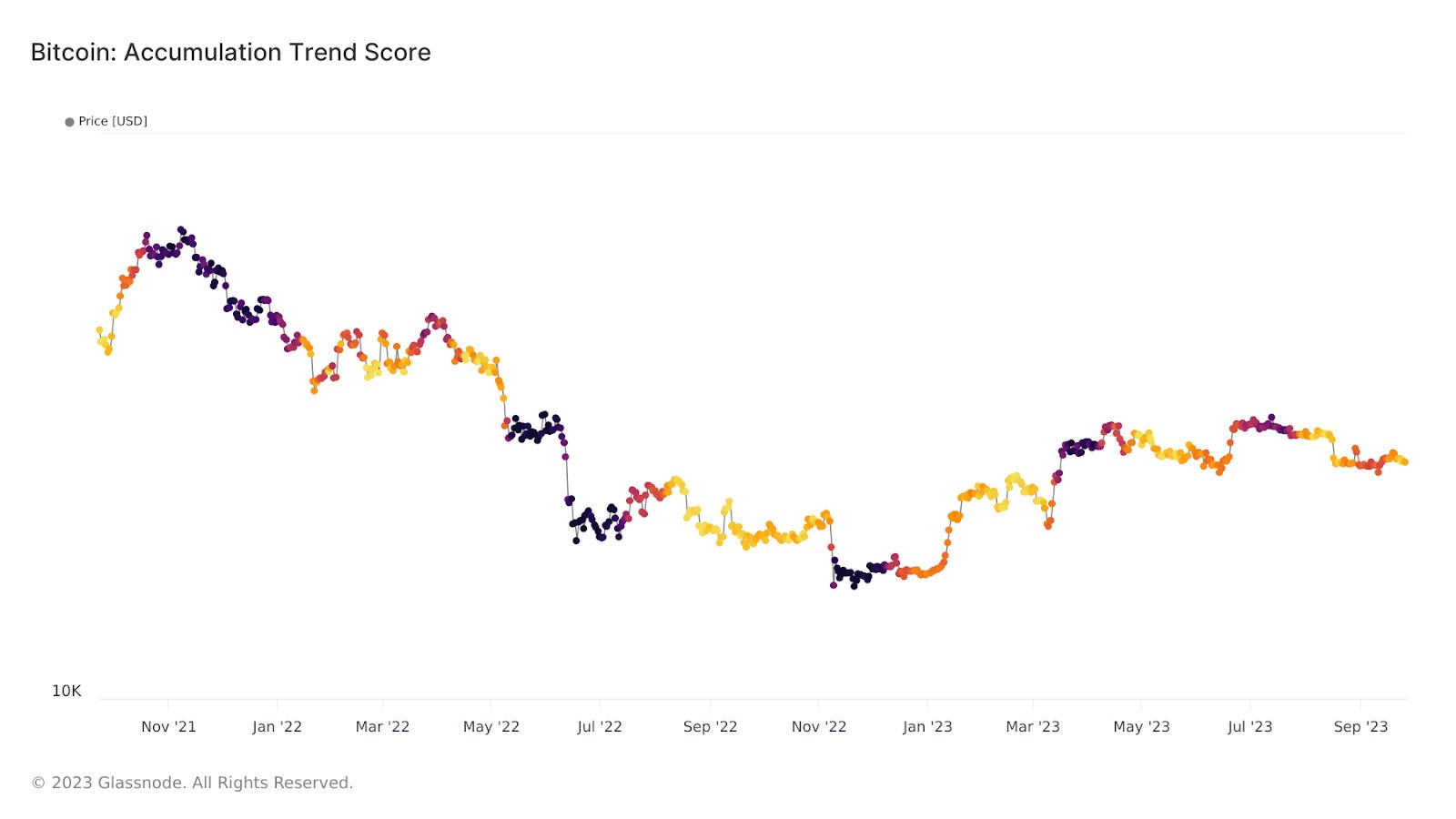 Despite the increase of long term holdings, the data suggests that many of the long term holdings are being done using multiple wallets or multiple places instead of one precise location. On-chain data suggests that accumulation per wallet is at a local low of about 14%. Although this does not match a yearly low, it is consistent throughout 2023 that wallets with an interest to accumulate are doing so on multiple wallets instead of just a single point of wealth.