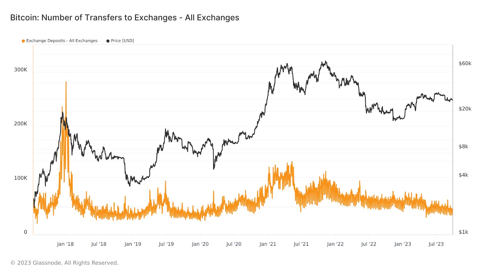 Although market price has been complicated and deposits have been down, there has been a massive increase in transactions in 2023 compared to previous years. Data shows that transactions have risen over 220% in the past 12 months. This shows significant activity on BTC, for both short term and long term transactions.