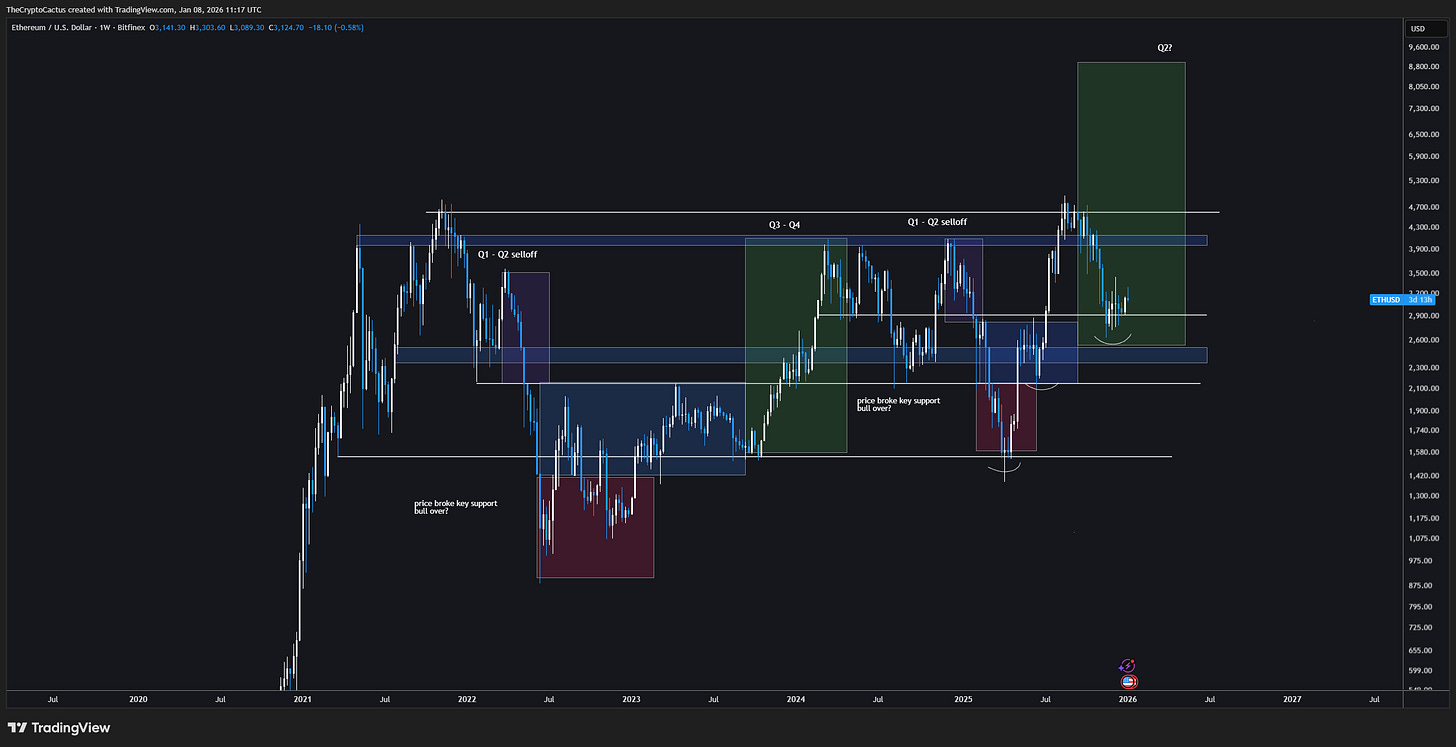 While price action might be a bit frustrating and a little disappointing, at least we have a chance to get a better entry if you are a buyer in 2026 and maybe even over the next few weeks we might also get the chance at buying in the low 2000’s this would be an ideal scenario in my opinion, if BTC does start to slide we should get some very very good entries on ETH and some other blue chip crypto projects. (some of these we will chart in the next newsletter)
